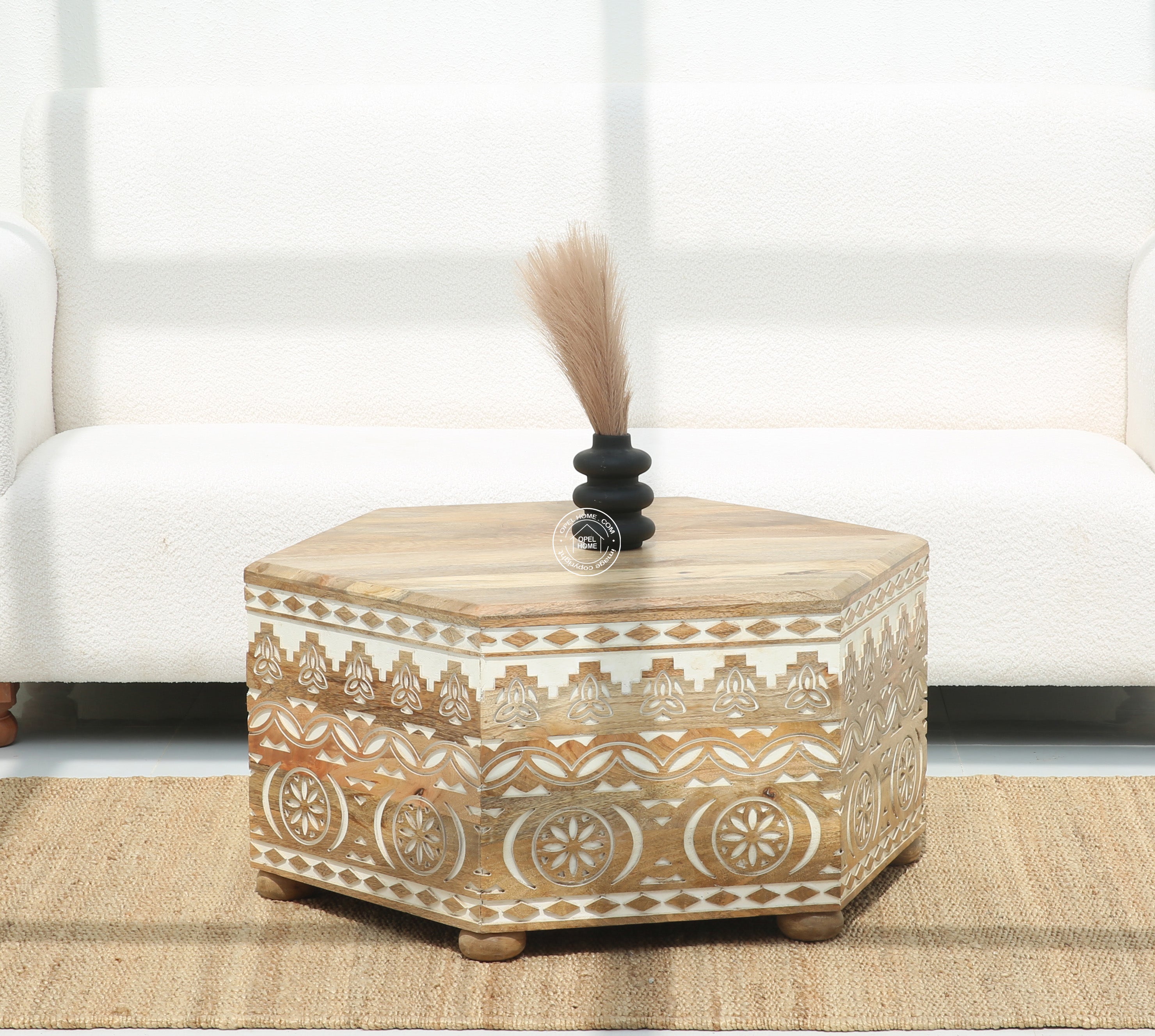 Hand-Carved Detailing – Intricately carved patterns around the table add artisanal charm and craftsmanship.