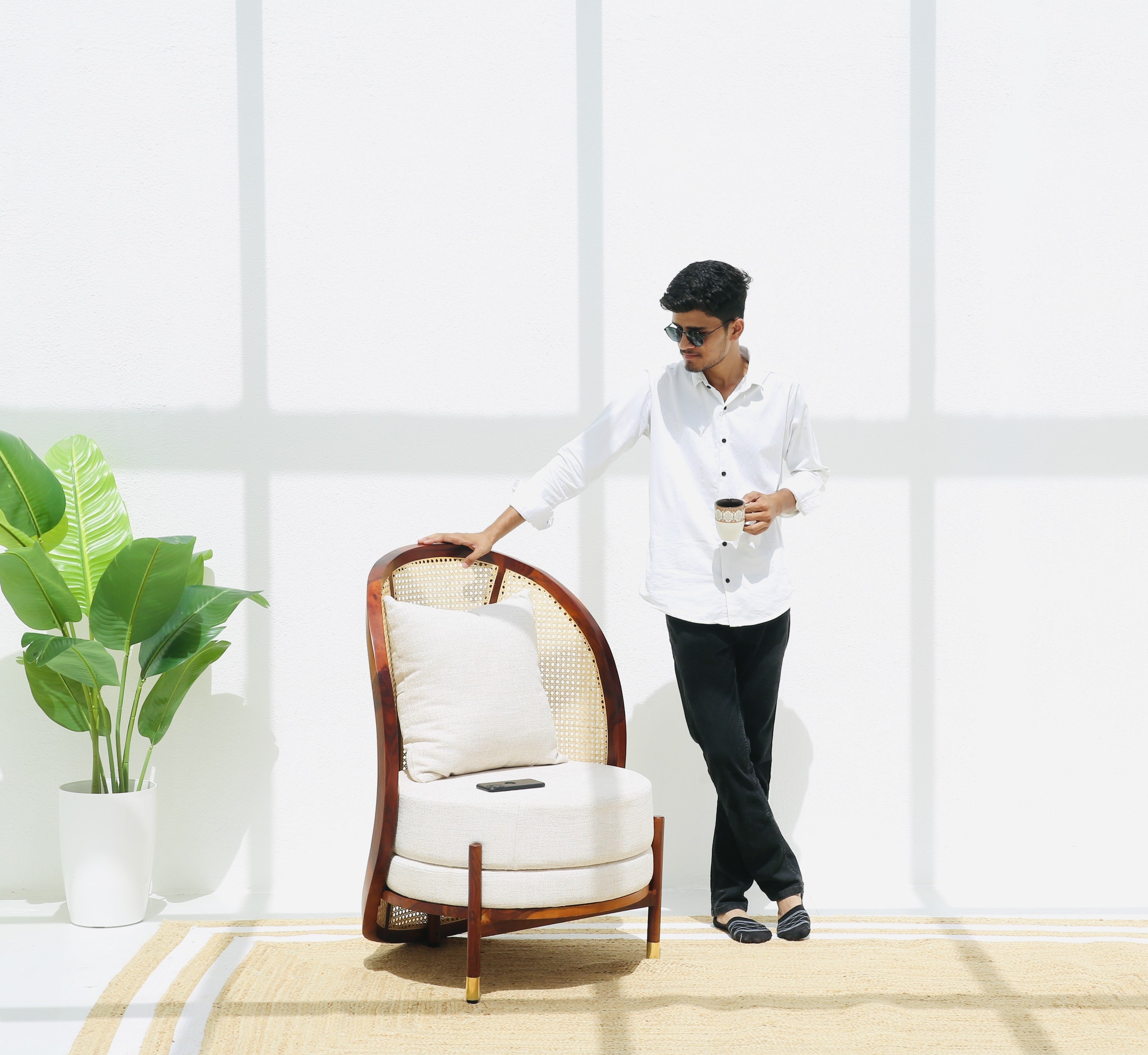Experience the perfect balance of nature and luxury with the Tone Rattan Lounge Chair. Expertly crafted from solid rosewood, detailed with a natural rattan backrest, and upholstered in soft cotton fabric, this chair is designed to bring timeless elegance into modern living.